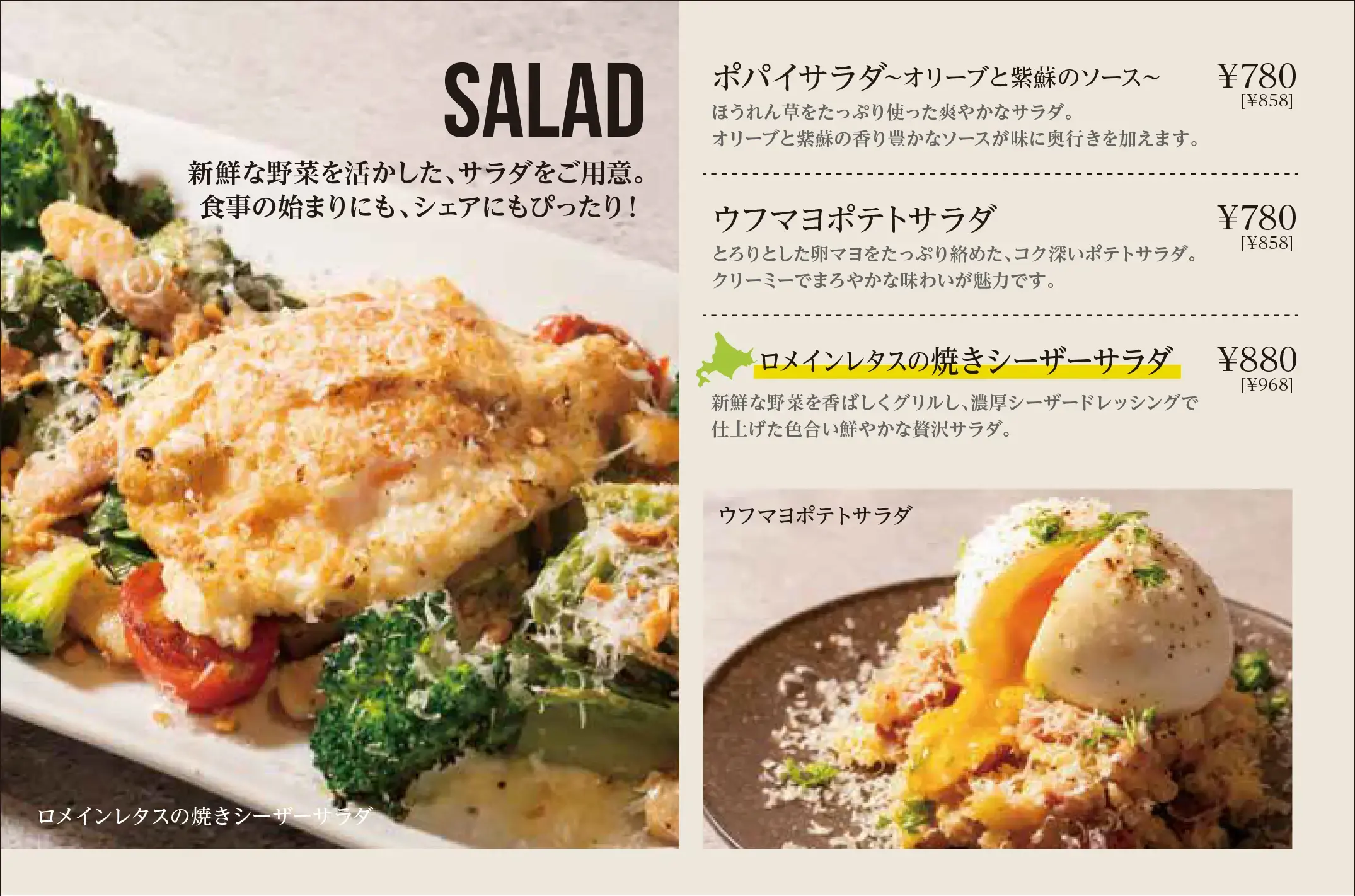 サラダ 新鮮な野菜の食感や香りを大切にした、ドワ33のサラダ。 焼き・生・温度差などを取り入れ、 ただ軽いだけでは終わらない、満足感のある一皿に仕上げています。 北海道産野菜を中心に、自家製ドレッシングやソースで味に奥行きをプラス。 食事の始まりとしても、シェアにもおすすめできる、 素材の魅力がまっすぐ伝わるサラダです。