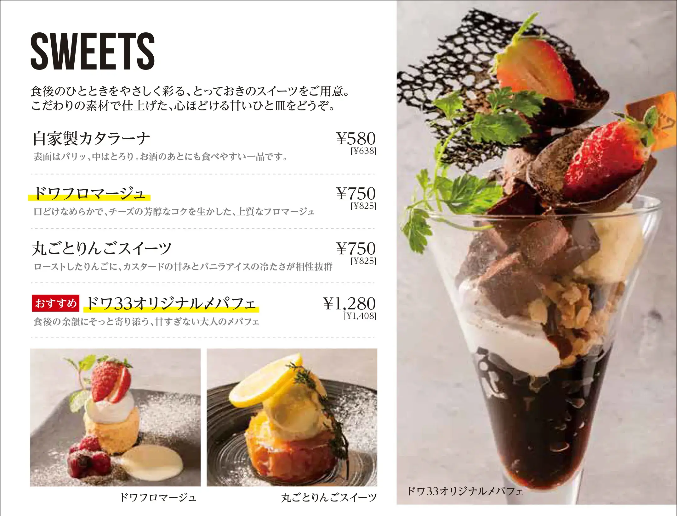 スイーツ ドワ33のスイーツは、甘さを抑え、 素材の香りやコクを引き立てることを意識しています。 食事の流れを邪魔せず、心地よく締めくくるためのデザートです。 チーズやフルーツを使った定番から、オリジナルパフェまで。 大人が楽しめる、落ち着いた甘さをご用意しています。