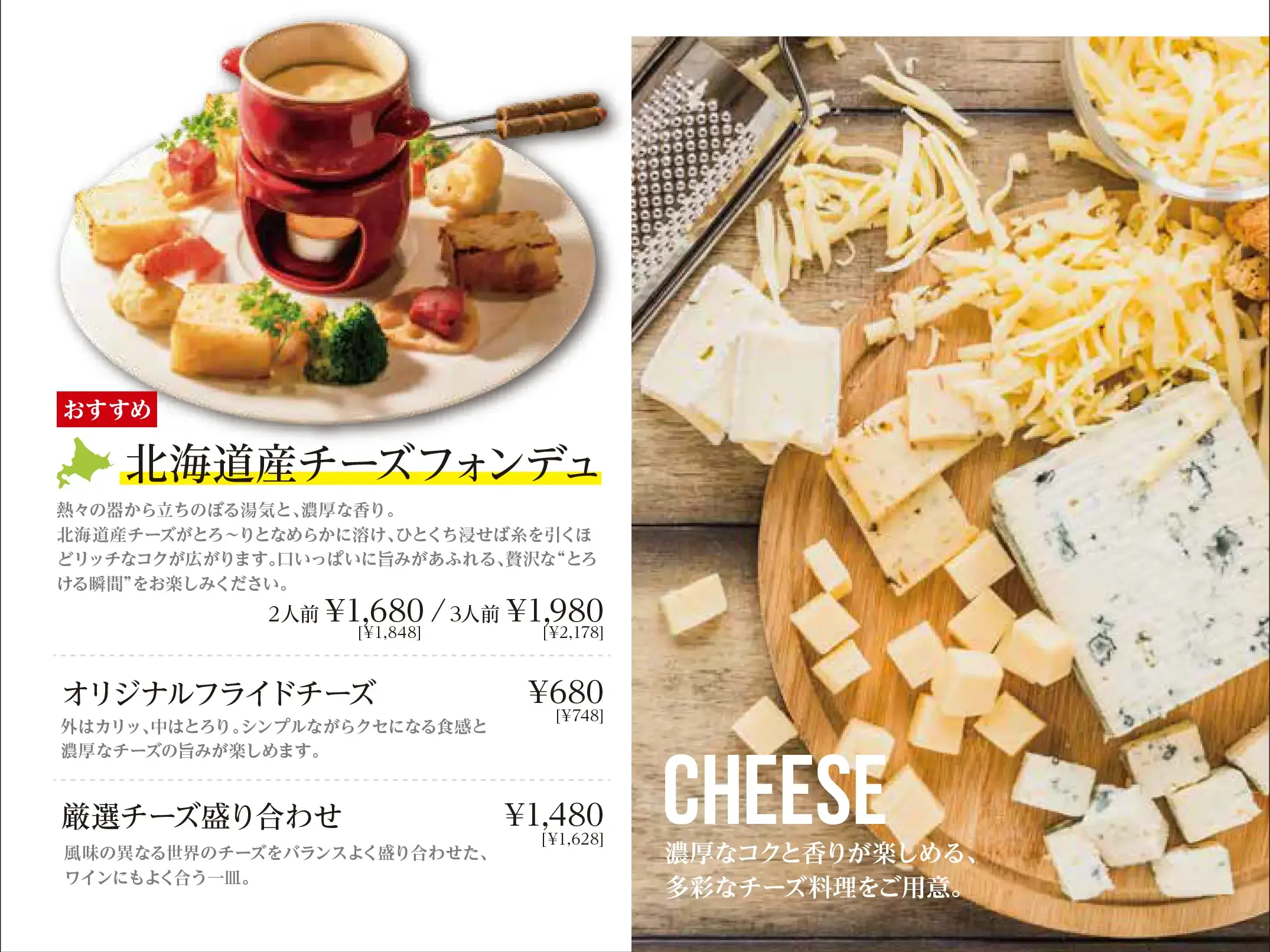チーズ ドワ33では、北海道産チーズを中心に、 香り・コク・口溶けのバランスを楽しめるチーズ料理をご用意しています。 温度や組み合わせにこだわり、チーズ本来の魅力を引き出します。 とろりと溶けるフォンデュから、風味豊かな盛り合わせまで。 ワインやお酒と合わせることで、 より一層深まる味わいをお楽しみください。