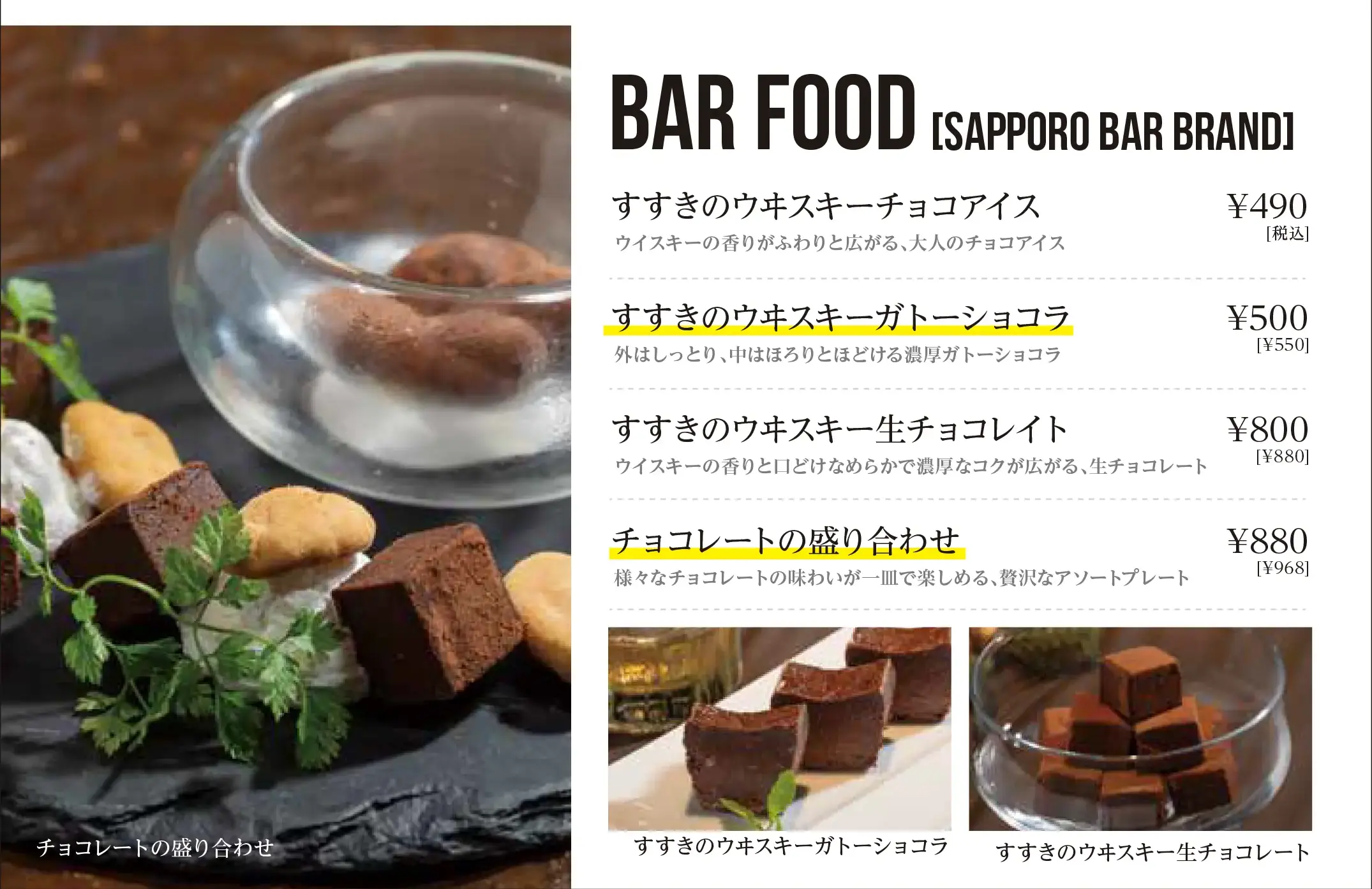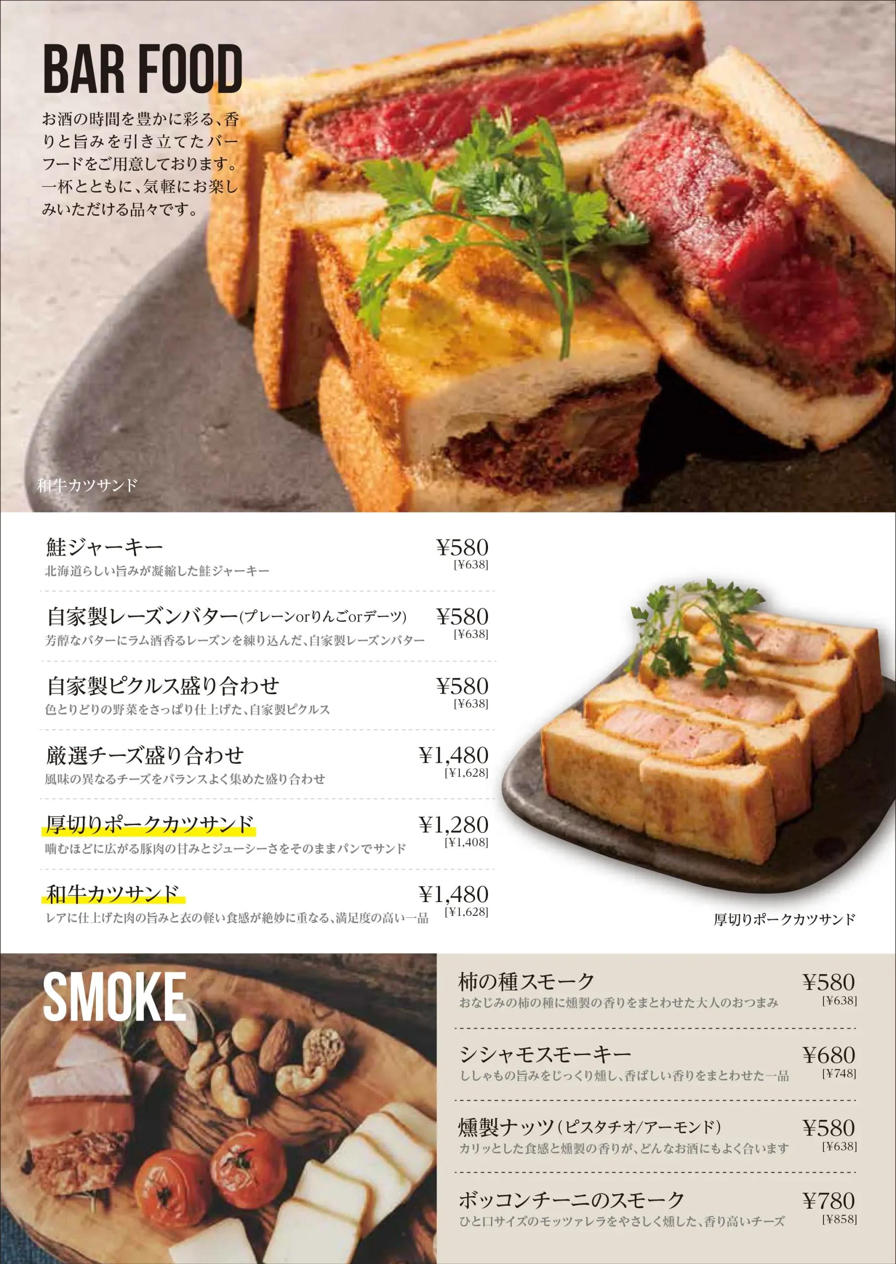 バーフード お酒とともに楽しむことを前提に考えたバーフード。 素材の旨みを活かし、 香りや余韻を大切に仕上げています。 カツサンドやチョコレートなど、 軽すぎず、重すぎない絶妙なバランス。 ゆったりとしたバータイムに寄り添う一皿です。