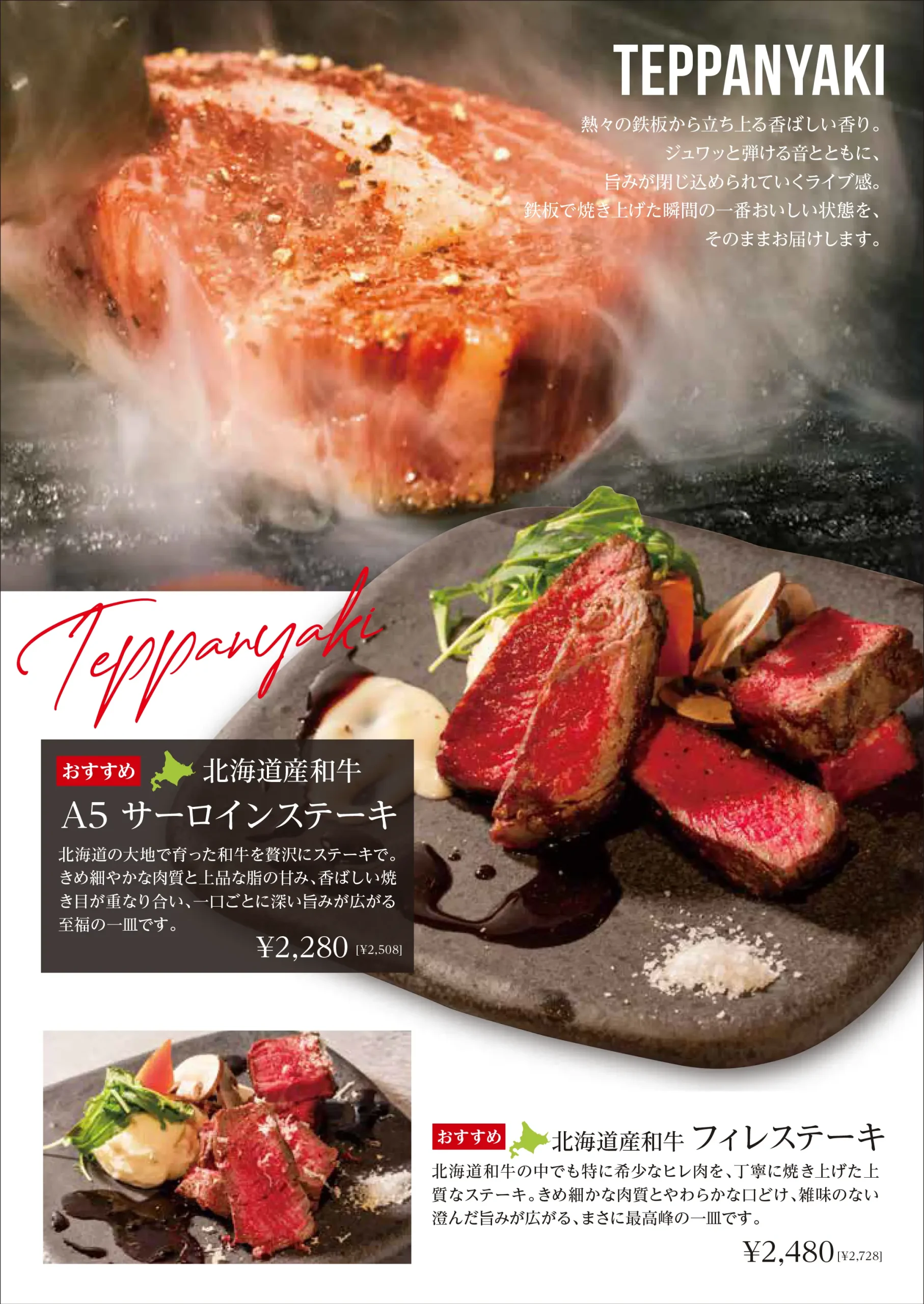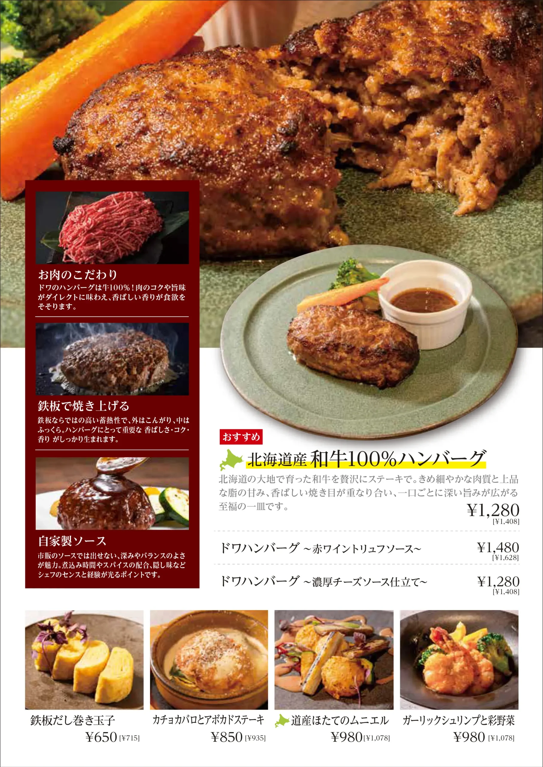 鉄板焼き 熱々の鉄板から立ち上る香ばしい香り、食欲をそそる焼き音。 ドワ33の鉄板焼きは、焼き上がるその瞬間までを含めて“料理”と考えています。 素材が持つ旨みを逃さず閉じ込め、最もおいしい状態でお届けするため、火入れには細やかな調整を重ねています。 北海道産和牛を中心に、ステーキやハンバーグなど定番の一皿まで幅広くご用意。 きめ細かな肉質と上質な脂の甘み、鉄板ならではの香ばしい焼き目が重なり合い、 一口ごとに深い満足感を感じていただける料理に仕上げています。