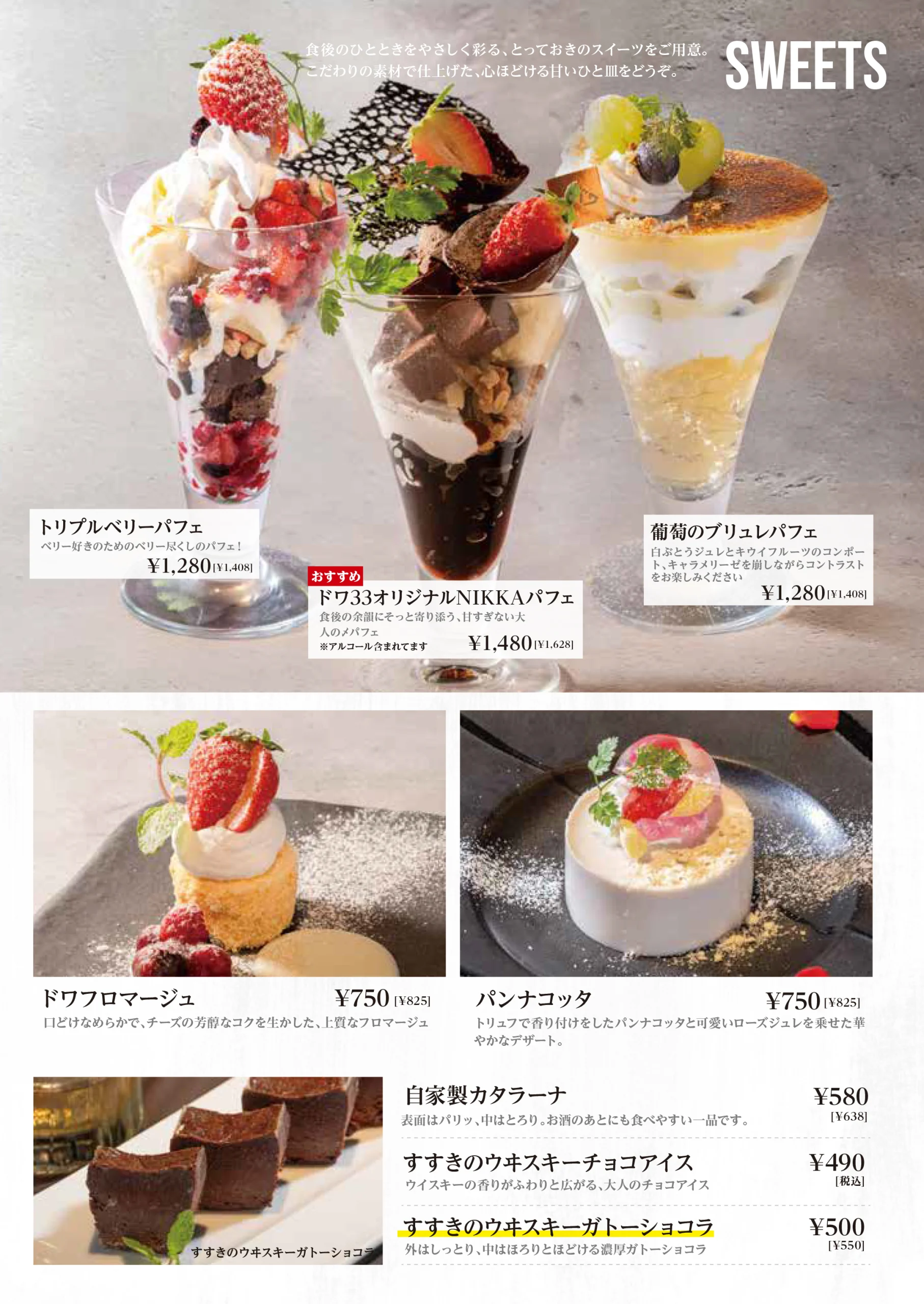 スイーツ ドワ33のスイーツは、甘さを抑え、 素材の香りやコクを引き立てることを意識しています。 食事の流れを邪魔せず、心地よく締めくくるためのデザートです。 チーズやフルーツを使った定番から、オリジナルパフェまで。 大人が楽しめる、落ち着いた甘さをご用意しています。