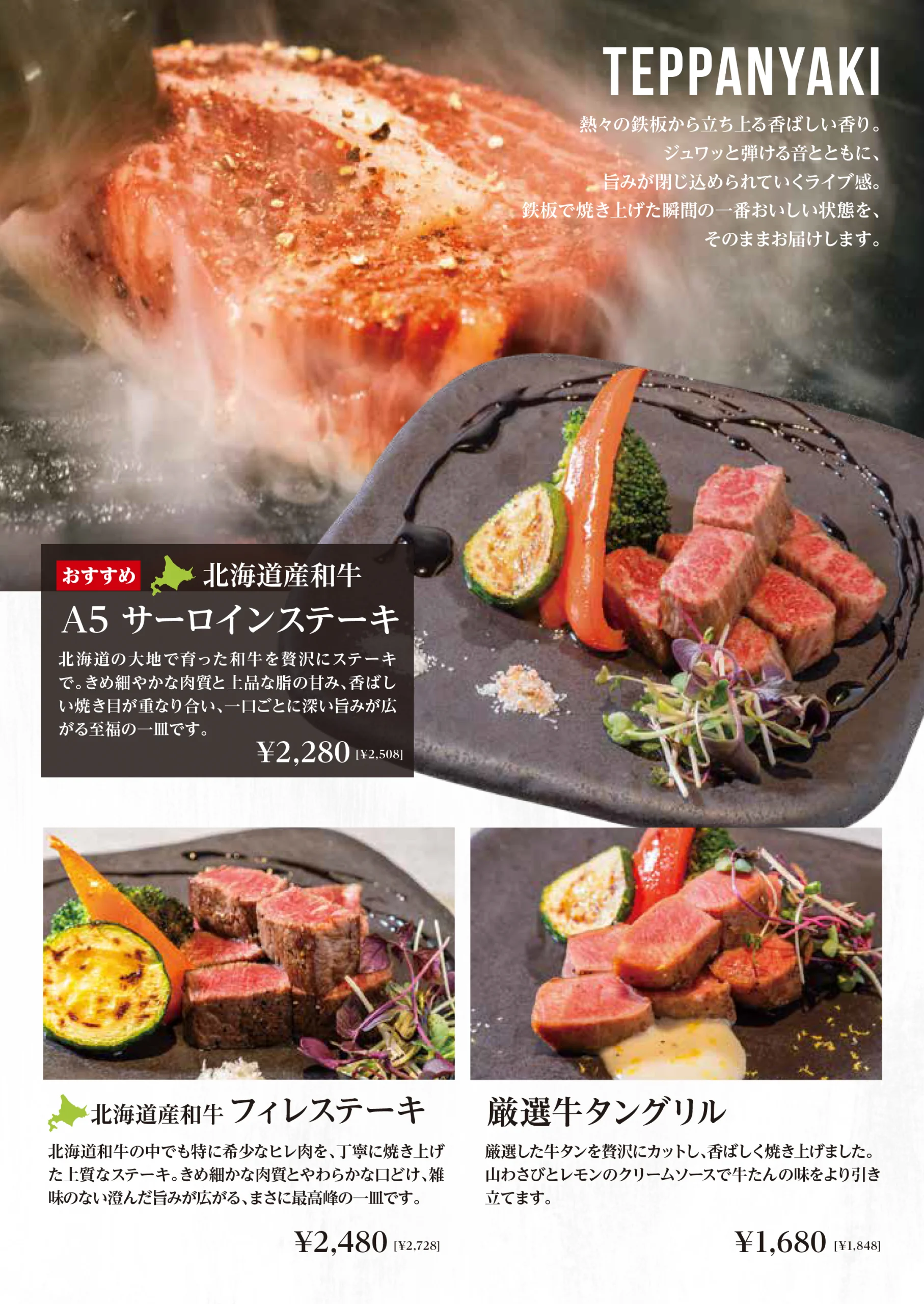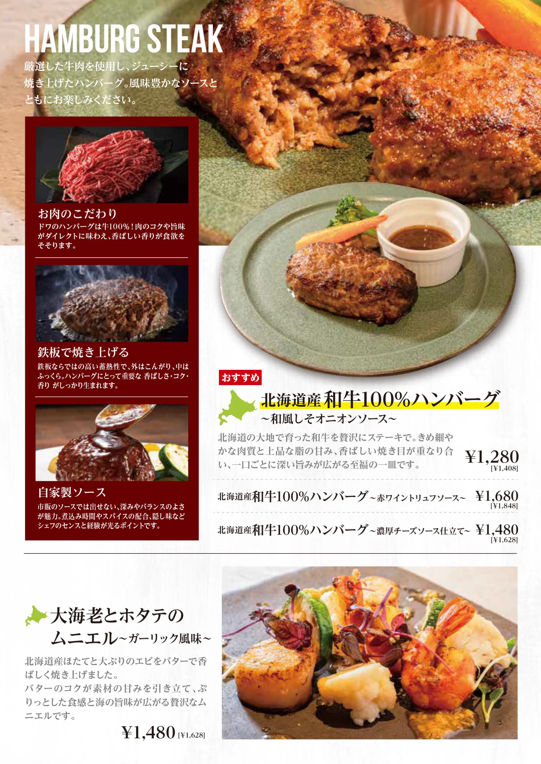 鉄板焼き 熱々の鉄板から立ち上る香ばしい香り、食欲をそそる焼き音。 ドワ33の鉄板焼きは、焼き上がるその瞬間までを含めて“料理”と考えています。 素材が持つ旨みを逃さず閉じ込め、最もおいしい状態でお届けするため、火入れには細やかな調整を重ねています。 北海道産和牛を中心に、ステーキやハンバーグなど定番の一皿まで幅広くご用意。 きめ細かな肉質と上質な脂の甘み、鉄板ならではの香ばしい焼き目が重なり合い、 一口ごとに深い満足感を感じていただける料理に仕上げています。